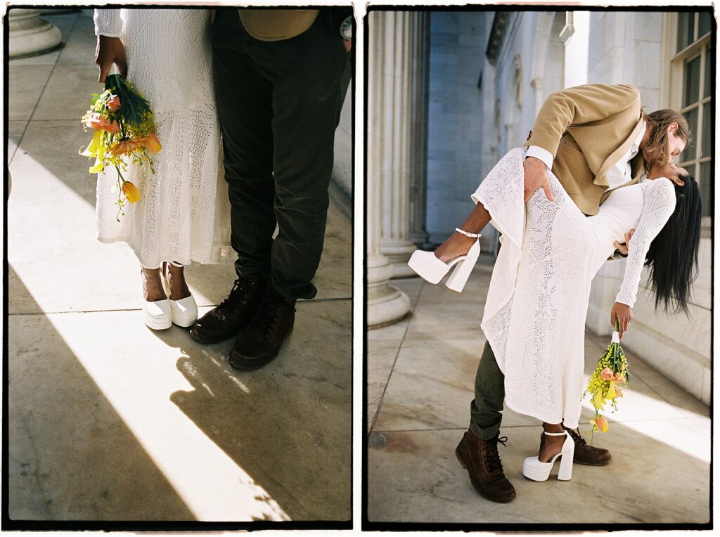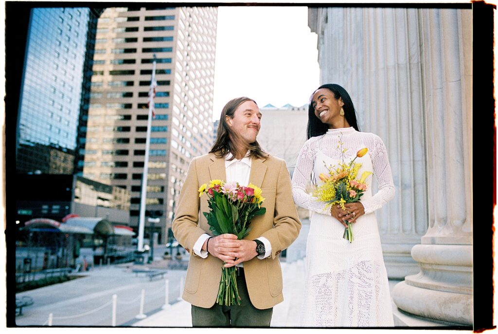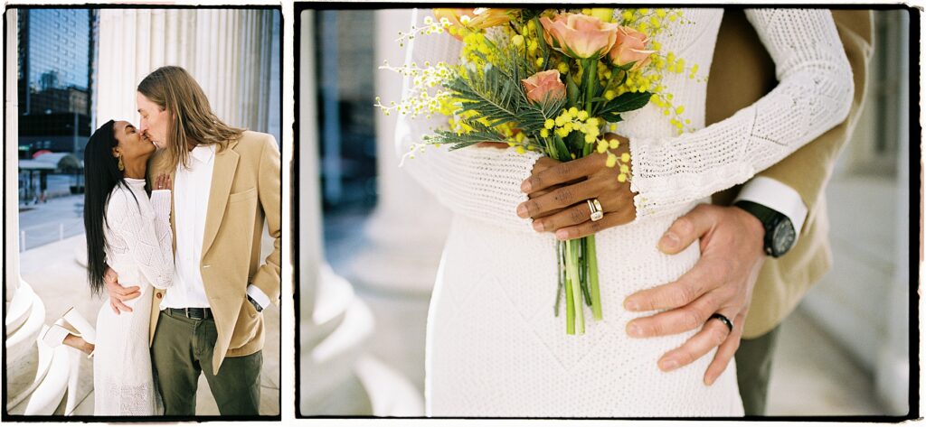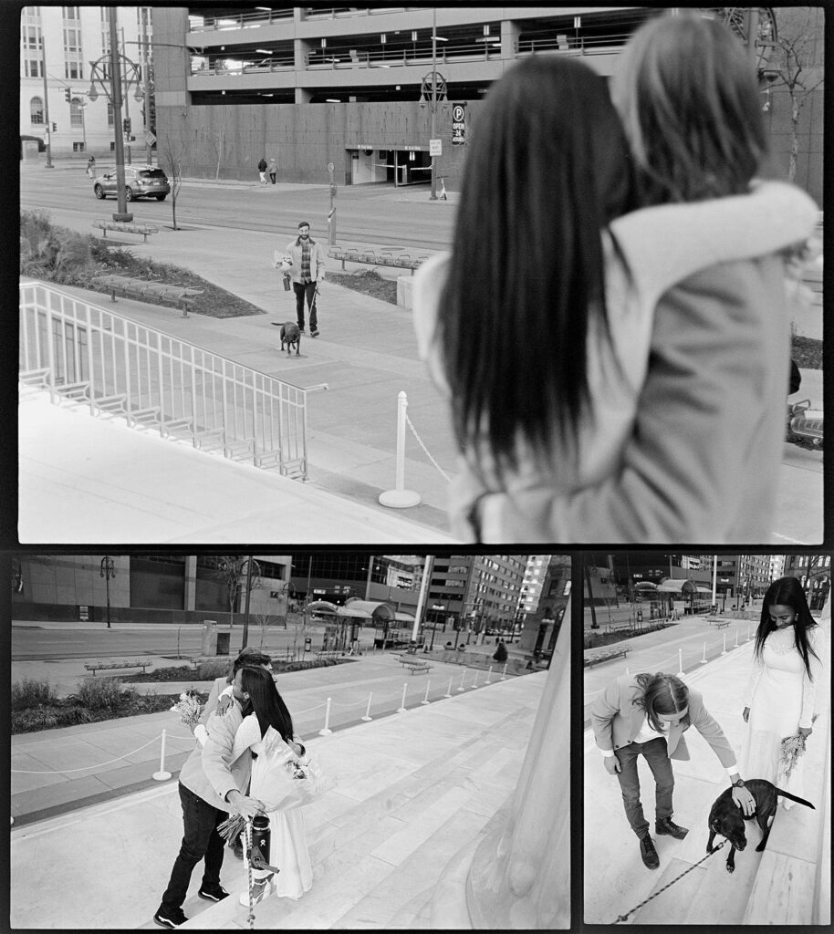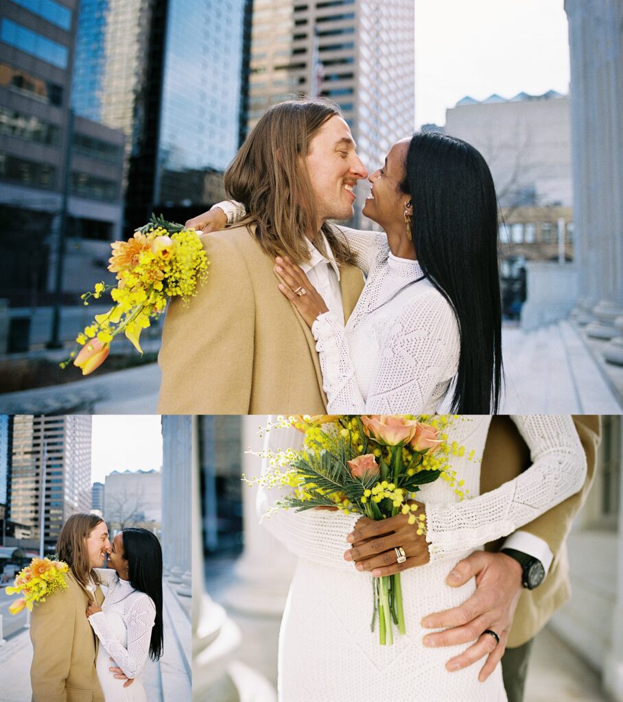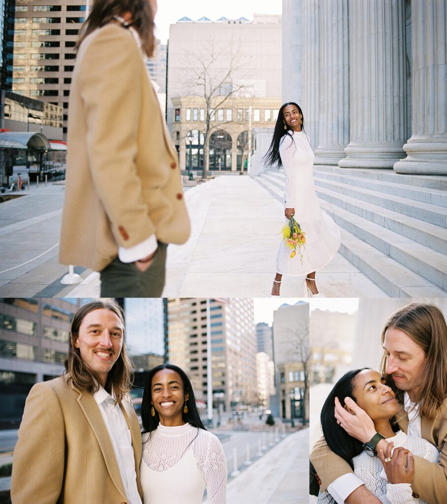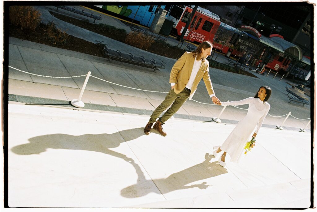 There’s something really special about these kinds of wedding days; there’s no big timeline rush, just two people celebrating their love for each other and simple moments together. As a Denver elopement photographer who specializes in film photography, these kinds of days are some of my favorite to document. The architecture, the city energy, and the light that streams in between the buildings, all come together beautifully.