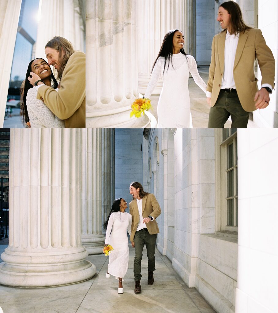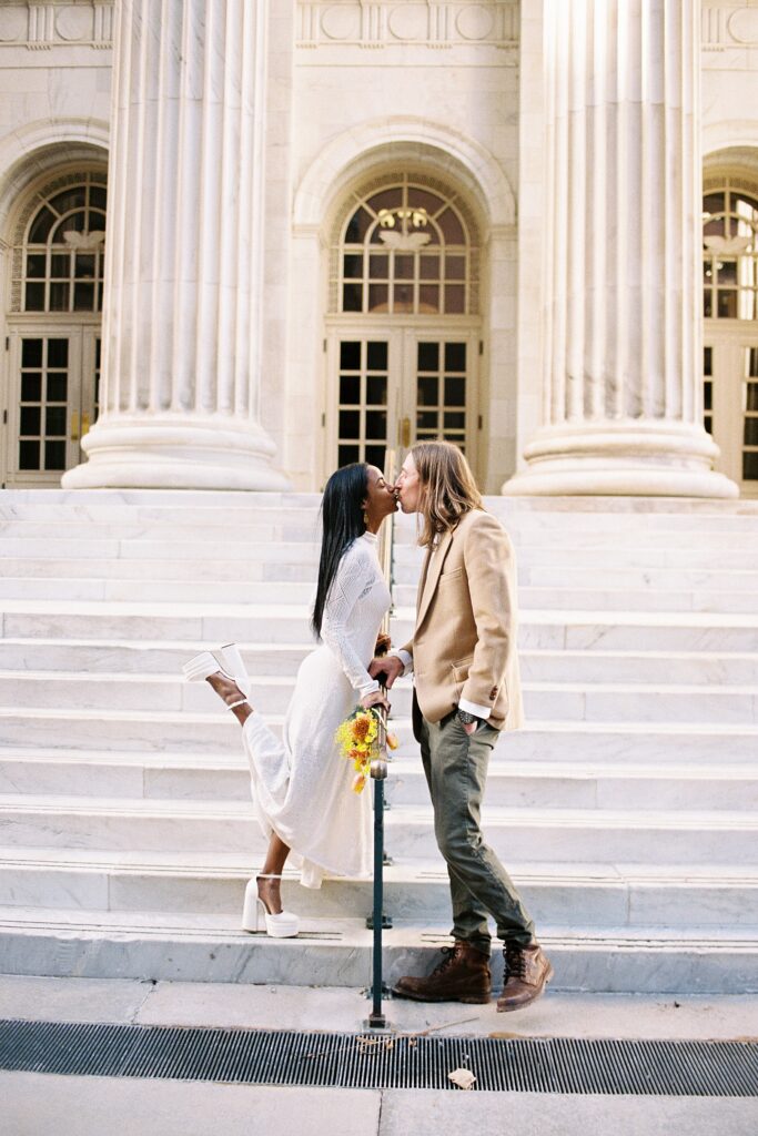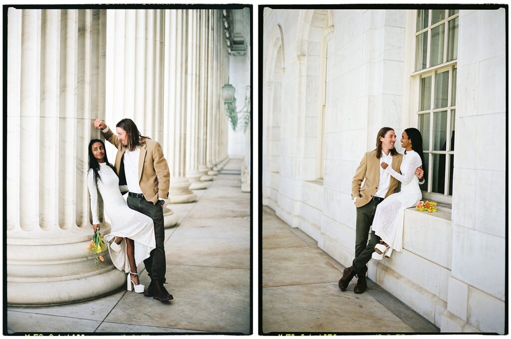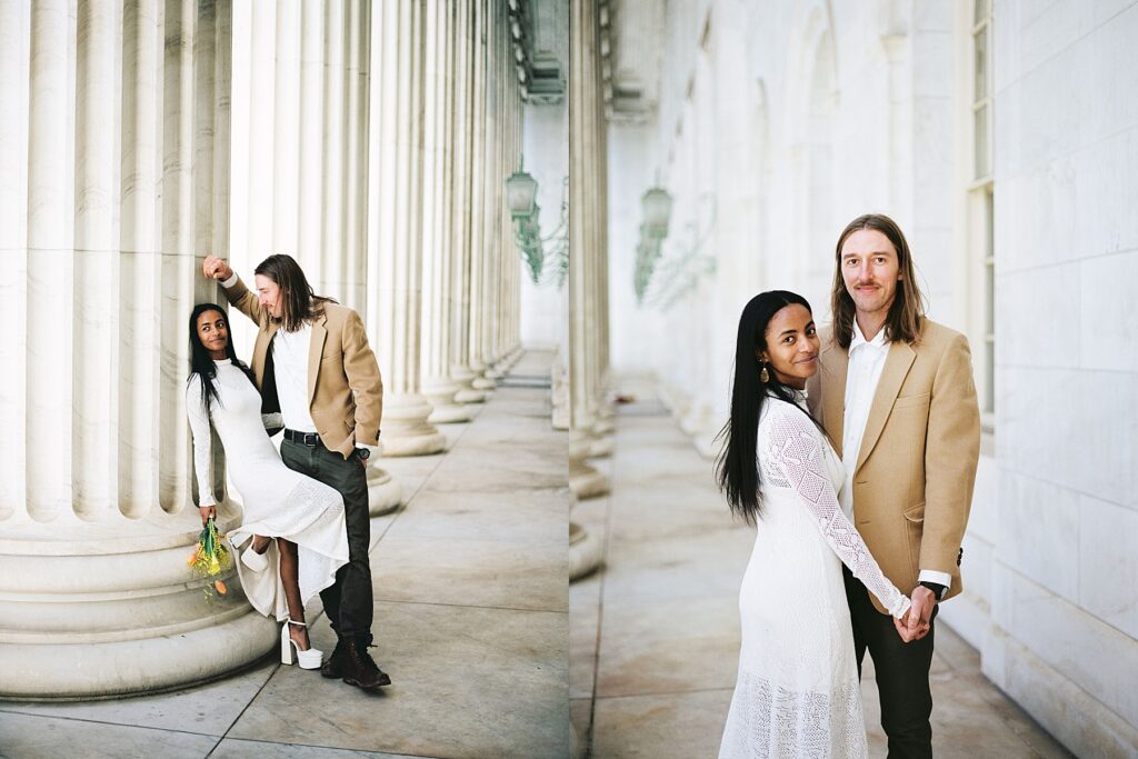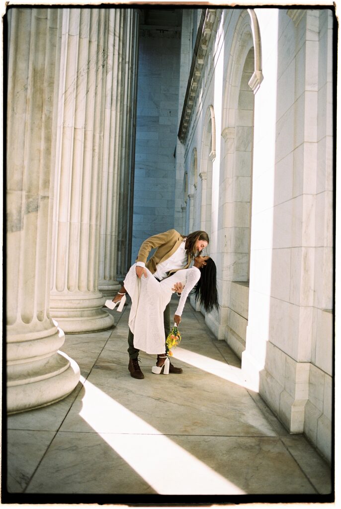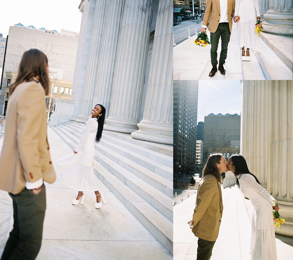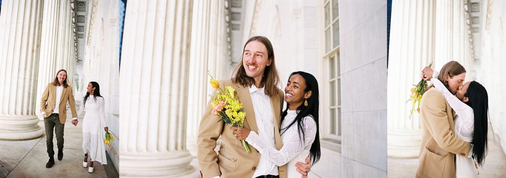 There’s something really special about these kinds of wedding days; there’s no big timeline rush, just two people celebrating their love for each other and simple moments together. As a Denver elopement photographer who specializes in film photography, these kinds of days are some of my favorite to document. The architecture, the city energy, and the light that streams in between the buildings, all come together beautifully.