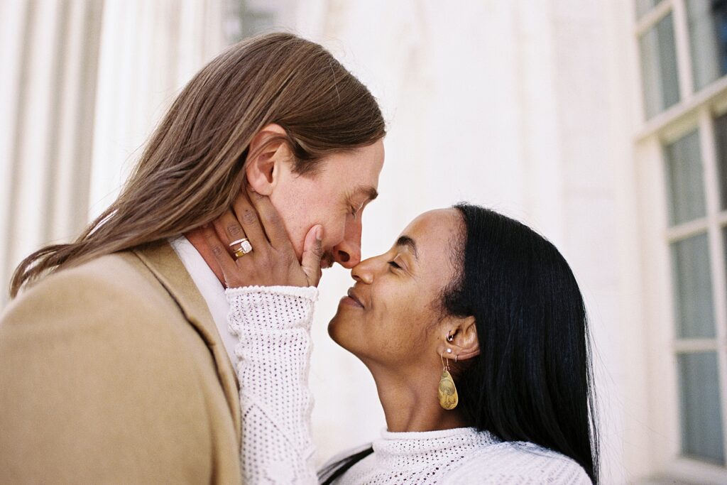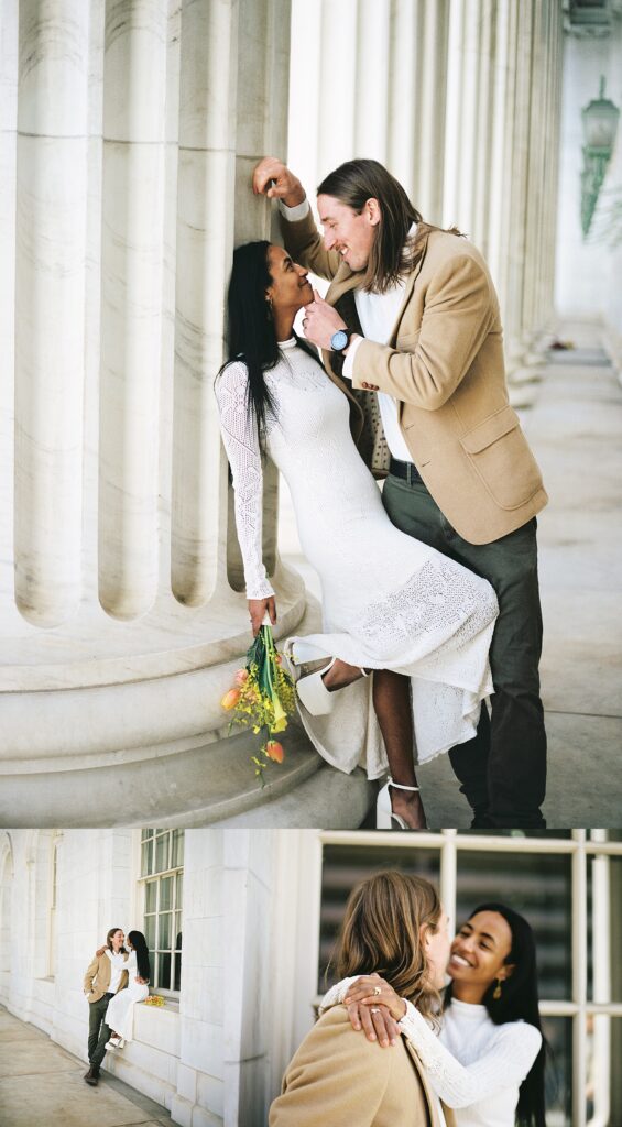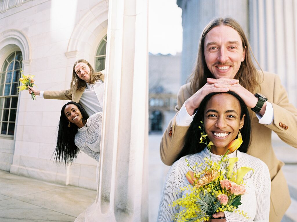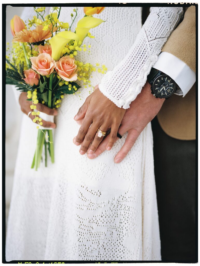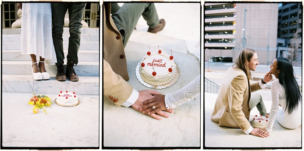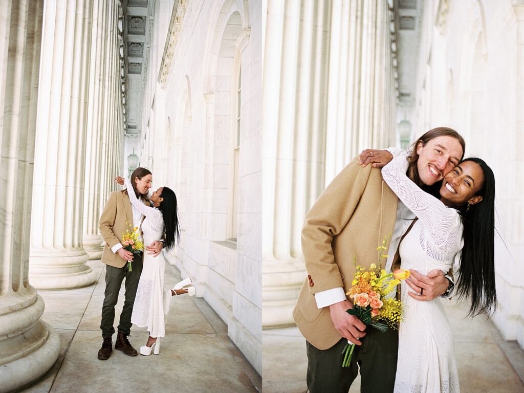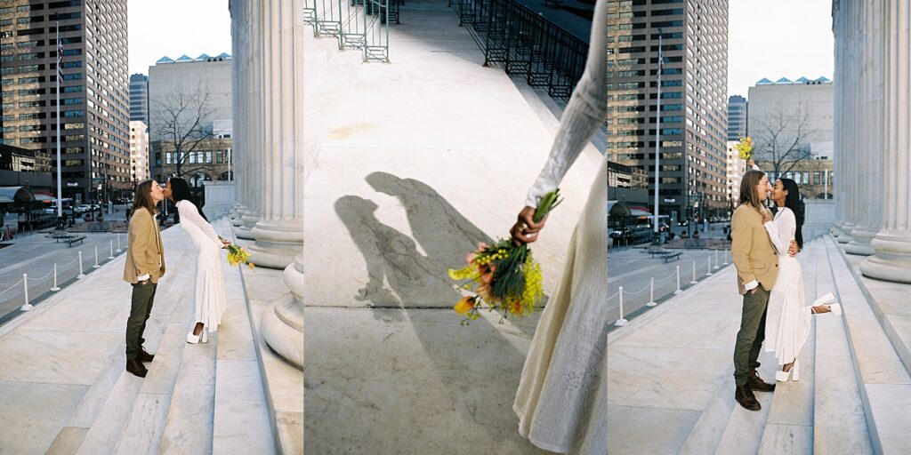 There’s something really special about these kinds of wedding days; there’s no big timeline rush, just two people celebrating their love for each other and simple moments together. As a Denver elopement photographer who specializes in film photography, these kinds of days are some of my favorite to document. The architecture, the city energy, and the light that streams in between the buildings, all come together beautifully.